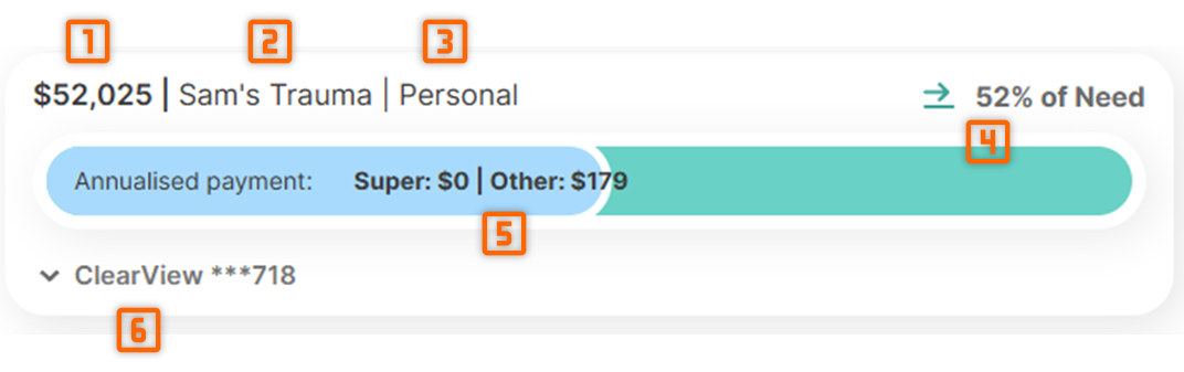 - The above example depicts a case where the client is underinsured for this type of cover and policy purpose. The graphic colours and styles will changed for cases of over insurance, no insurance needs analysis, and no cover associated with insurance need.