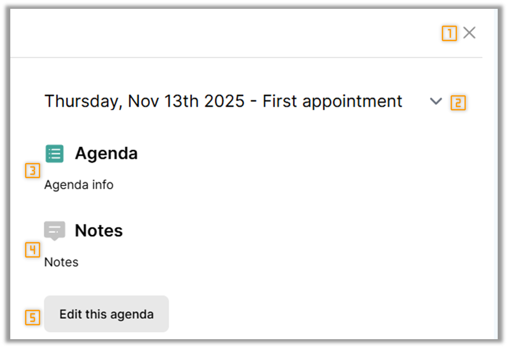 - Edit this agenda: Clicking this allows you to edit the Agenda and Notes fields directly within the popover rather than navigating to the dedicated Agenda's view.